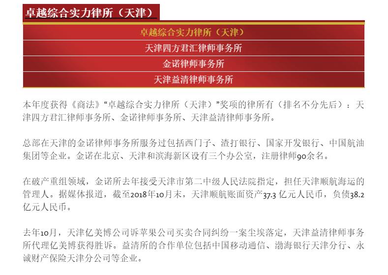 2020年4月8日,《商法》杂志(China Business Law Journal)公布了2020年度商法卓越律所大奖名单。天津益清律师事务所凭借出色的专业能力和良好的市场口碑,荣获“卓越综合实力律所(天津)”年度大奖。