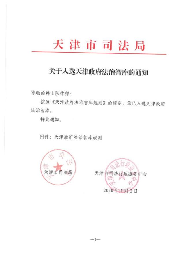 喜讯一:祝贺我所主任韩士队入选天津政府法治智库
