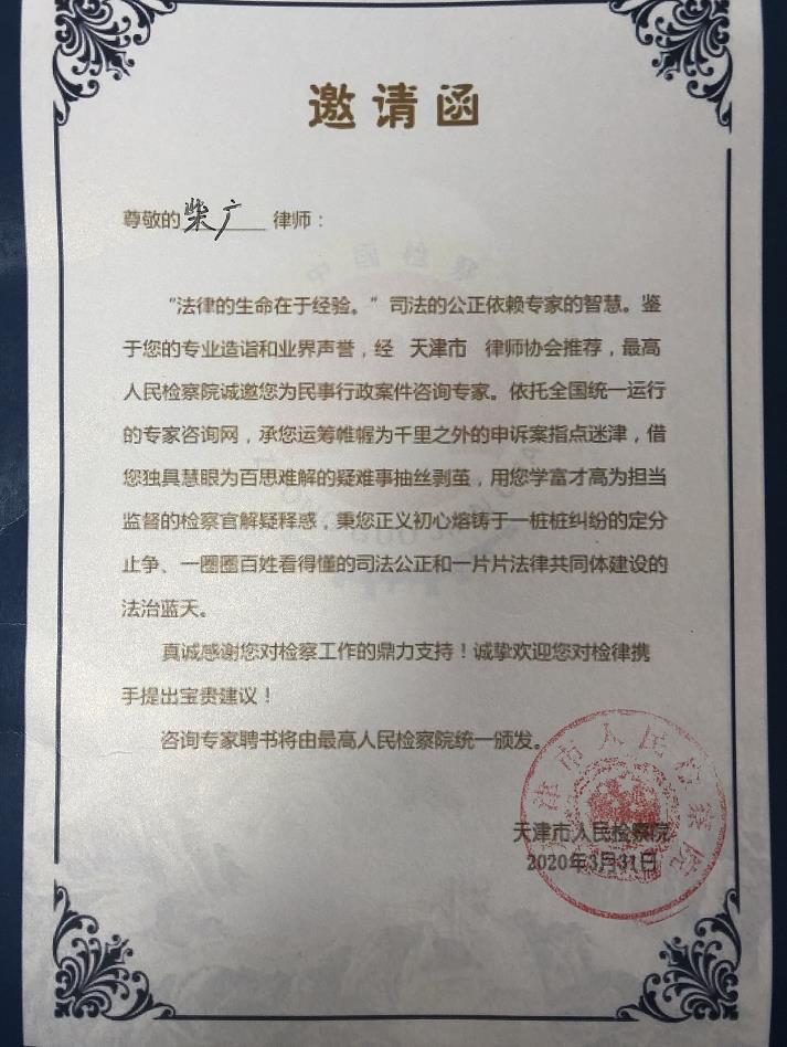 我所副主任柴广律师经天津市律师协会推荐,受邀入选最高人民检察院民事行政案件咨询专家,将通过检察机关民事行政案件专家咨询网,助力各地检察官高效办理案件。