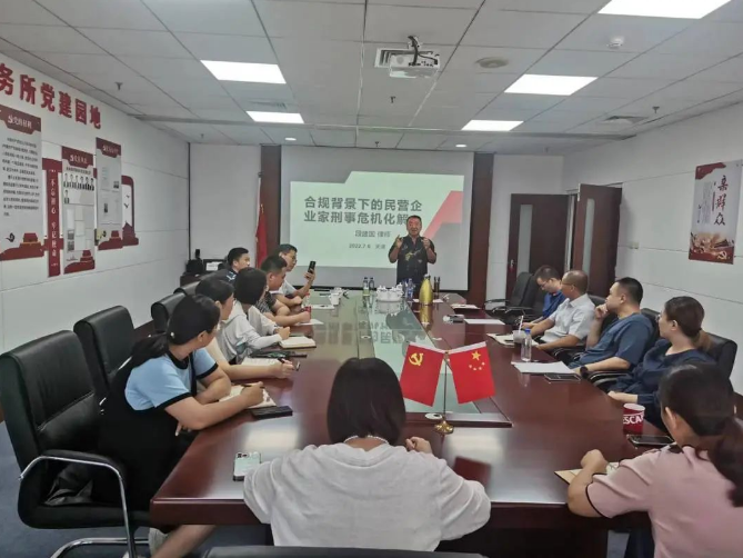 为了进一步提高我所律师的专业能力,促进律师行业的发展,7月9日上午,由北京市天用律师事务所名誉主任段建国担任主讲的《合规背景下的民营企业家刑事危机化解》主题刑事合规的讲座,采用线下的形式在天津益清(滨海)律师事务所会议室举行,滨海分所部分律师参加了此次讲座。