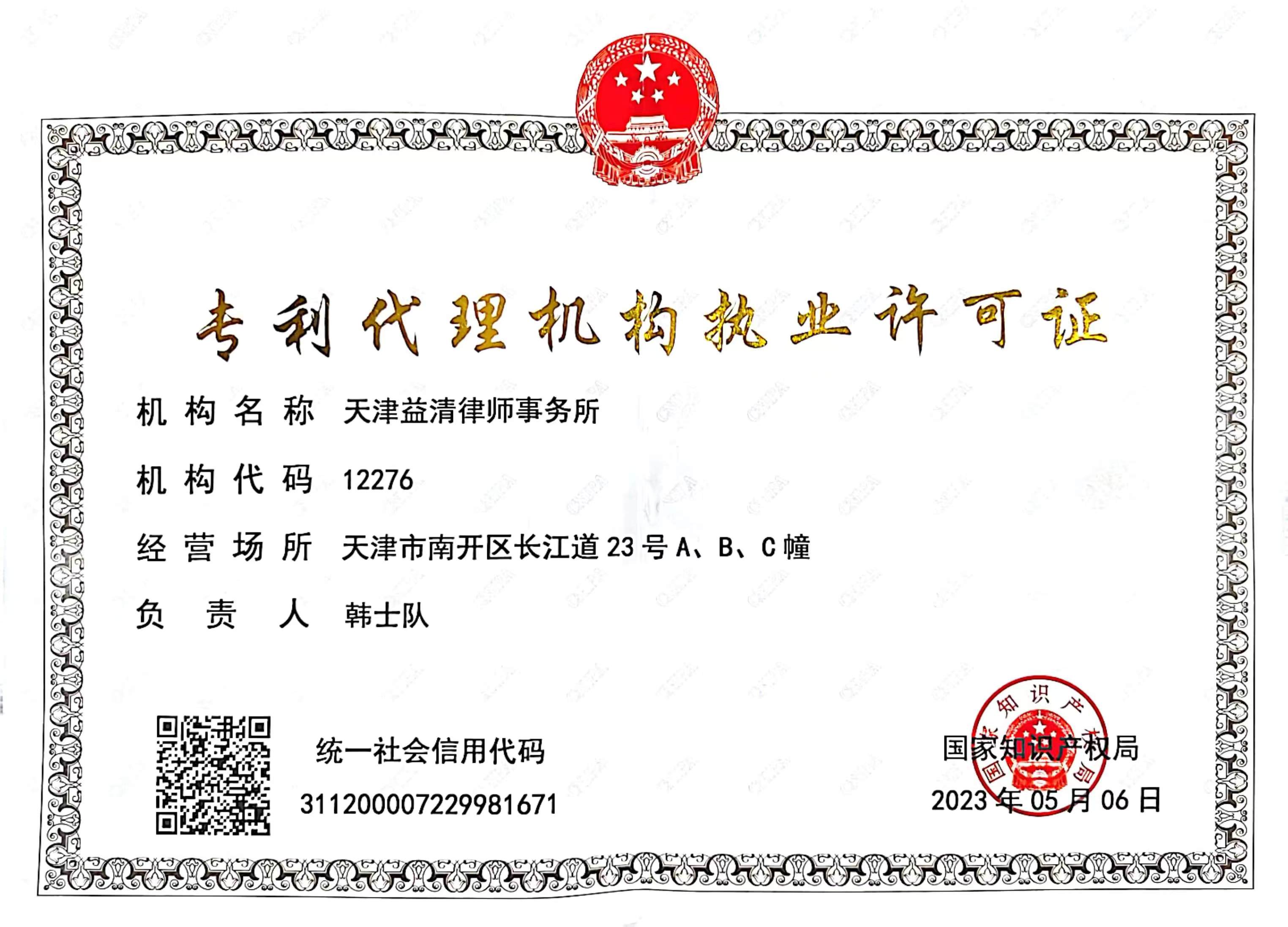 2023年5月6日,经中华人民共和国国家知识产权局批准,天津益清律师事务所获得专利代理机构执业许可证(机构代码12276),成功开辟专利代理业务新领域。