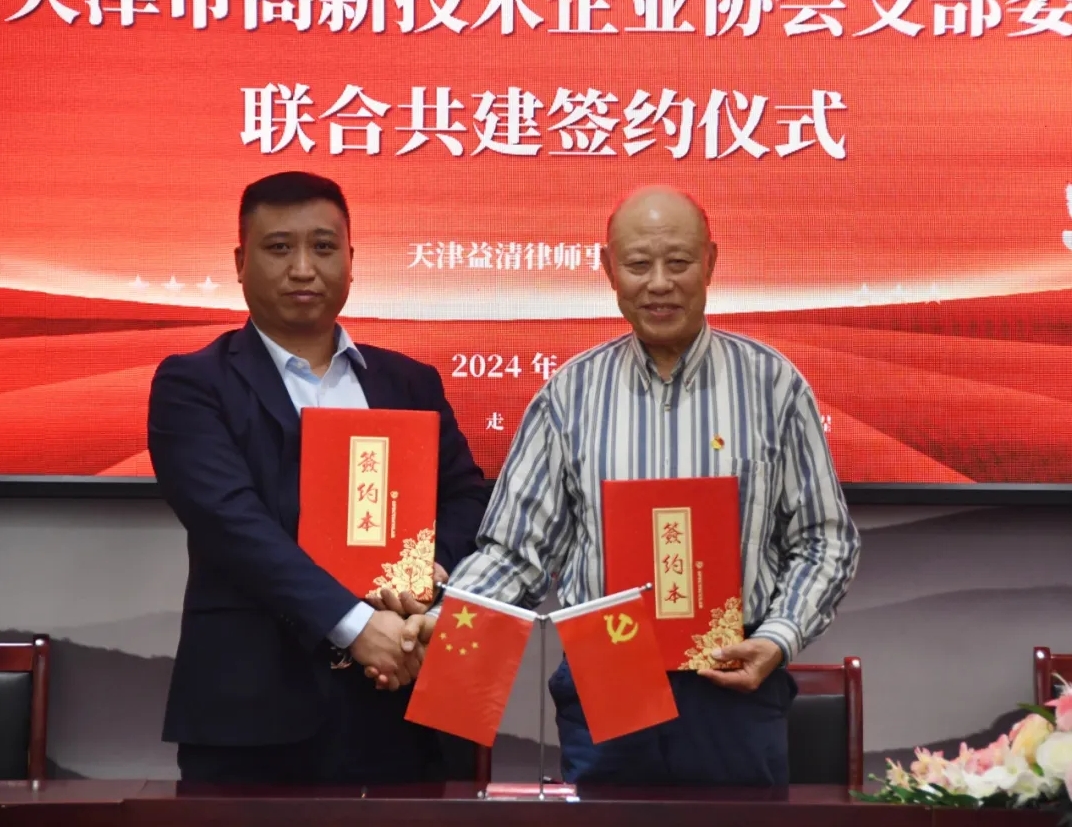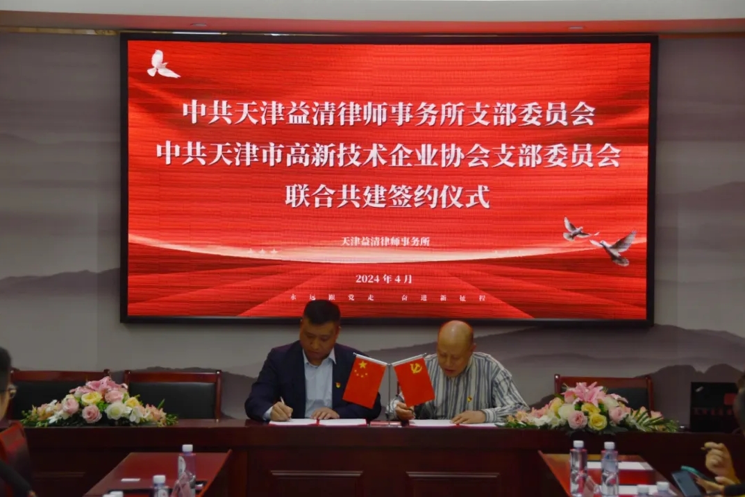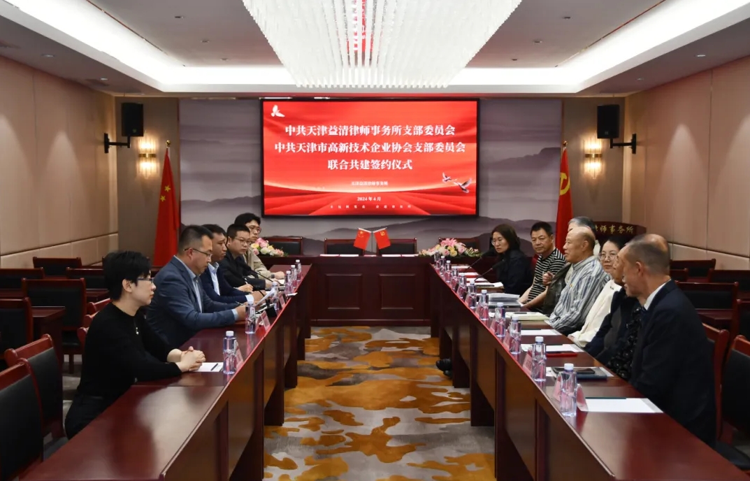 2024年4月11日下午,中共天津益清律师事务所支部委员会和中共天津市高新技术企业协会支部委员会在我所开展联合共建签约仪式。中共天津市高新技术企业协会党支部书记刘志刚、专家组成员王绍祖以及企业代表、天津益清律师事务所党支部副书记毛成、纪律委员韩明星、组织委员张璐、股权证券部部长杨玥、副部长吴志勇、律师孙韶聪参加了此次活动。