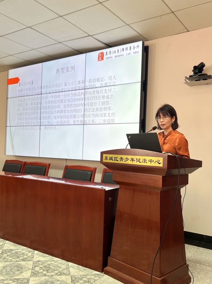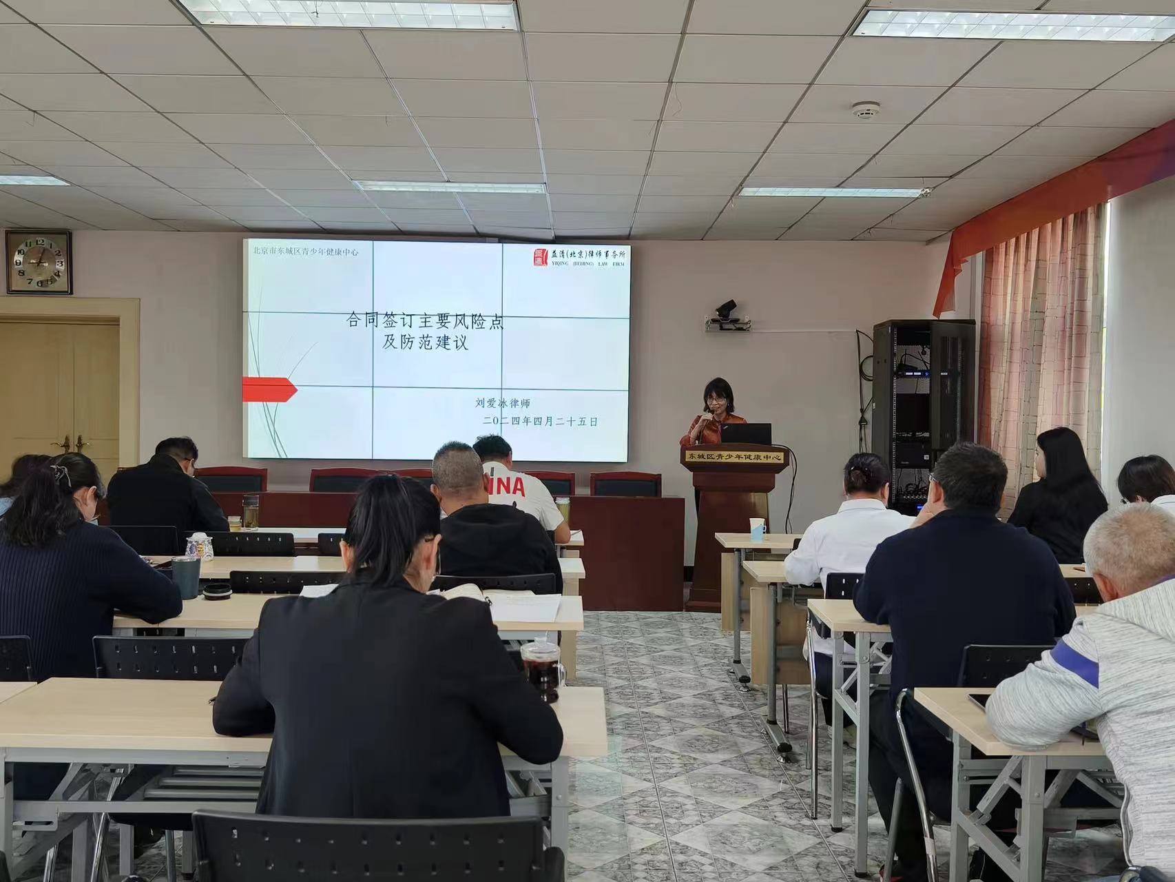 为加强合同管理,提高合同经办人员的风险防控意识,2024年4月25日,天津益清(北京)律师事务所应北京市东城区青少年健康中心邀请,为全体职工进行了一场《合同签订主要风险点及防范建议》的法治宣传讲座,由我所民事法律服务中心部长刘爱冰律师主讲,林茜钰协助开展。