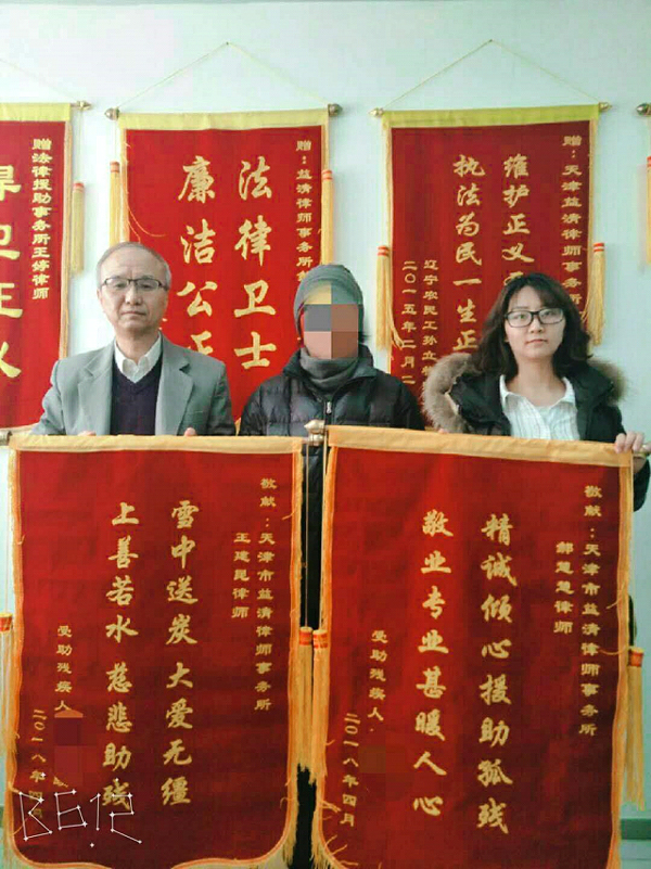 2018年4月8日下午,刘某面带喜悦之色来到天津益清律师事务所,为我所法律援助站王建昆、郝慧慧两位律师送上两面写到“雪中送炭,大爱无疆,上善若水,慈悲助残”、“精诚倾心,援助孤残,敬业专业,甚暖人心”的锦旗。这是为何呢?小编带您探个究竟: