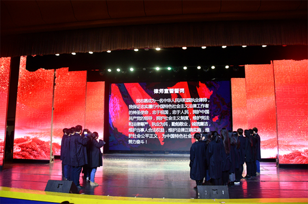 活动中,我所陈彩静律师、宋慧律师同其他20余名律师一起,身着律师袍、佩戴徽章面向国旗庄严宣誓:“我志愿成为一名中华人民共和国执业律师,我保证忠实履行中国特色社会主义法律工作者的神圣使命……!”铿锵有力的誓言,指引着广大律师恪守对国家忠诚的信念,积极践行职业使命,全力为法治社会建设贡献力量。
