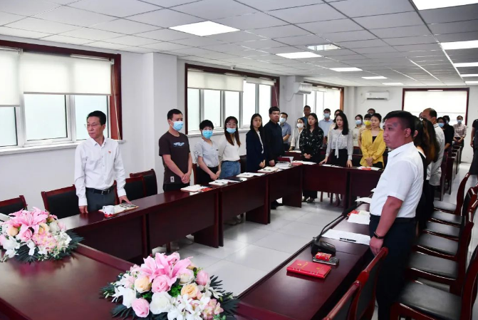 会议伊始,在场党员全体起立,纷纷面向国旗和党旗行注目礼。威严而庄重的《义勇军进行曲》在会议室中回响,全体党员目光坚毅,对伟大的祖国和中国共产党心怀敬意。
