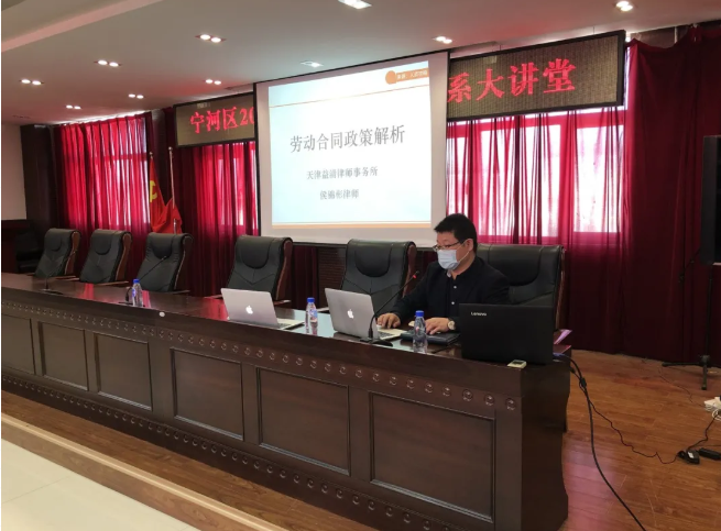 为加强企业尊法、用法意识,规避公司经营风险,提高员工法律意识及综合管理水平。2020年11月13日,天津益清律师事务所侯锦彬律师、王扬律师受天津市宁河区人力资源和社会保障局邀请,为辖区内的企业展开《劳动合同政策解析》讲座。