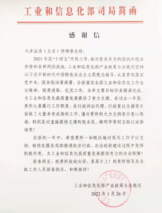 近日,工业和信息化部产业政策与法规司向天津益清(北京)律师事务所发来感谢信。