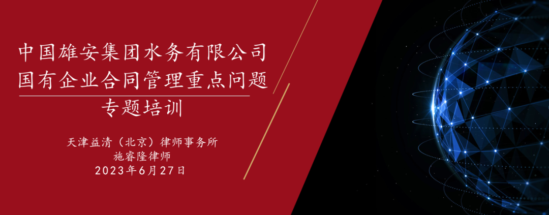 近日,天津益清(北京)律师事务所施睿隆律师受邀为中国雄安集团水务有限公司(以下简称“雄安水务公司”)提供主题为《国有企业合同管理重点问题》的法律培训讲座。此次培训在雄安郊野公园一层会议室举行,雄安水务公司各部门负责人、合同管理研修班学员、运营各项目负责人通过线上线下方式参与会议。