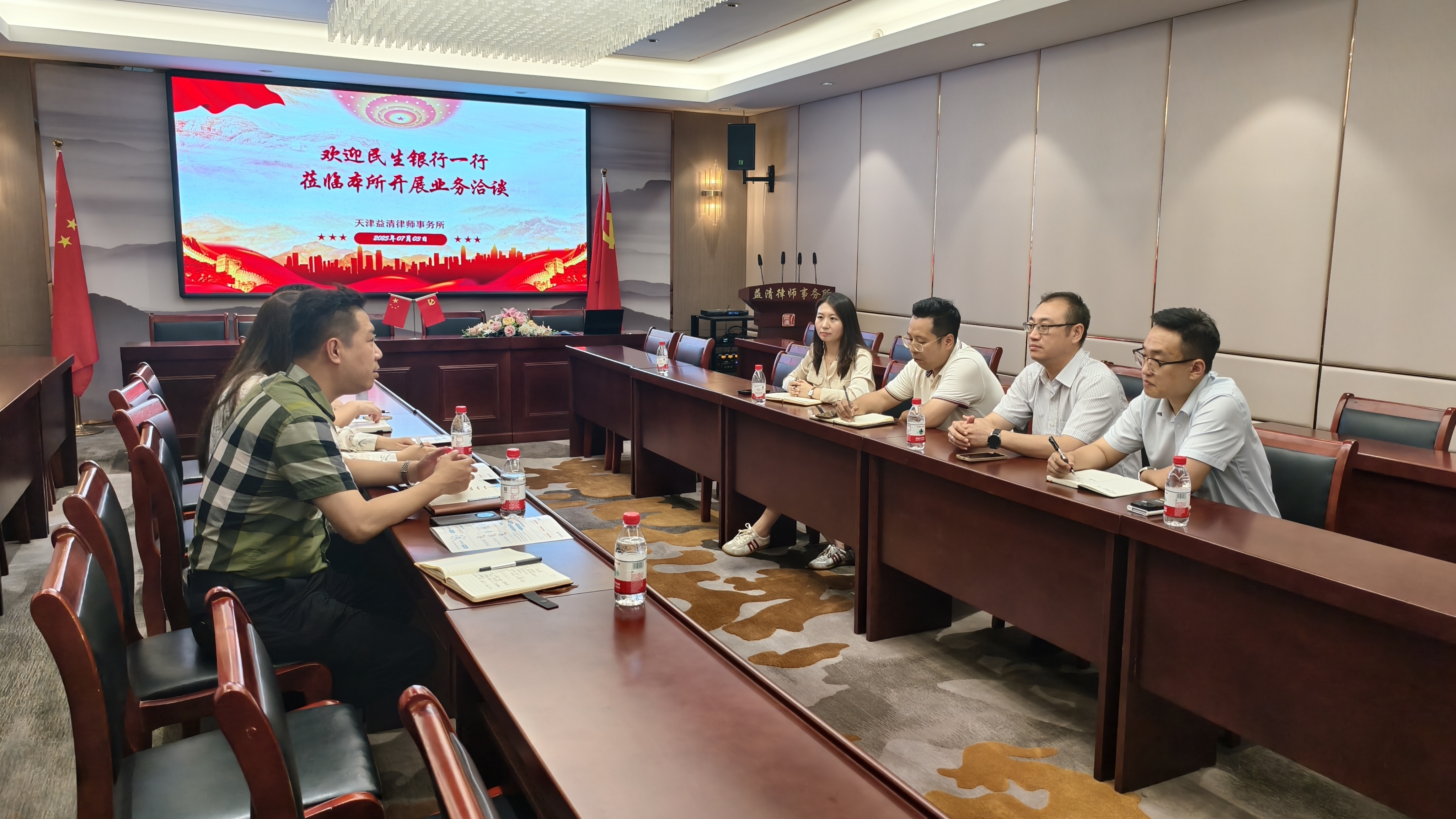 2025年7月3日,民生银行天津分行机构部云圣、民生银行天津分行翟羽、民生银行红桥支行副行长唐亮、民生银行红桥支行郭嘉莅临益清律师事务所,就双方未来的业务合作方向进行了深入洽谈,此次洽谈不仅加深了双方的了解,更为未来的合作奠定了坚实的基础。